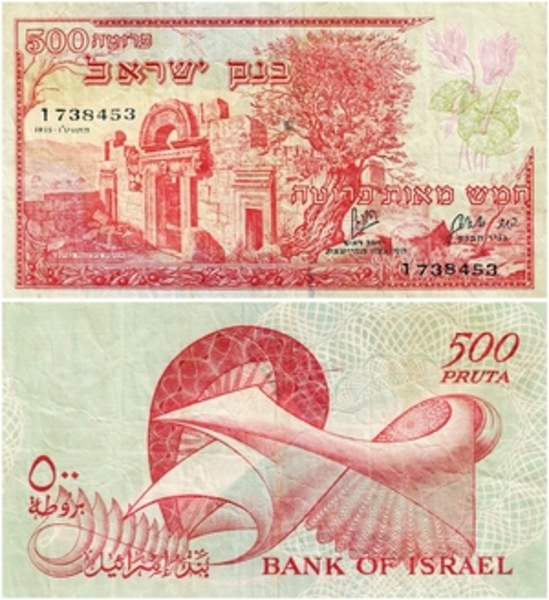 ציור מופשט; המילים "500 פרוטה" ו"בנק ישראל" בערבית ובאנגלית.