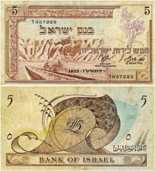 | נוף הנגב, וברקע – התיישבות וציוד לעבודת אדמה; המלים "חמש לירות ישראליות" ו"בנק ישראל" בעברית. | צד הפנים: |