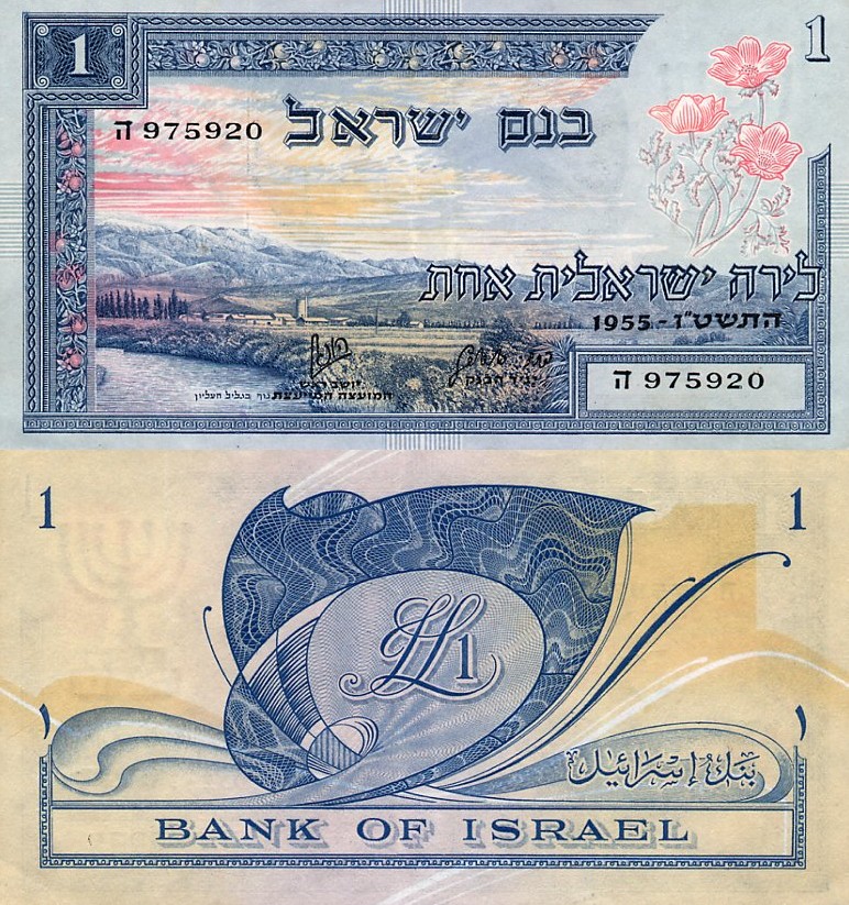 נוף הגליל העליון; המלים "לירה ישראלית אחת" ו"בנק ישראל" בעברית.